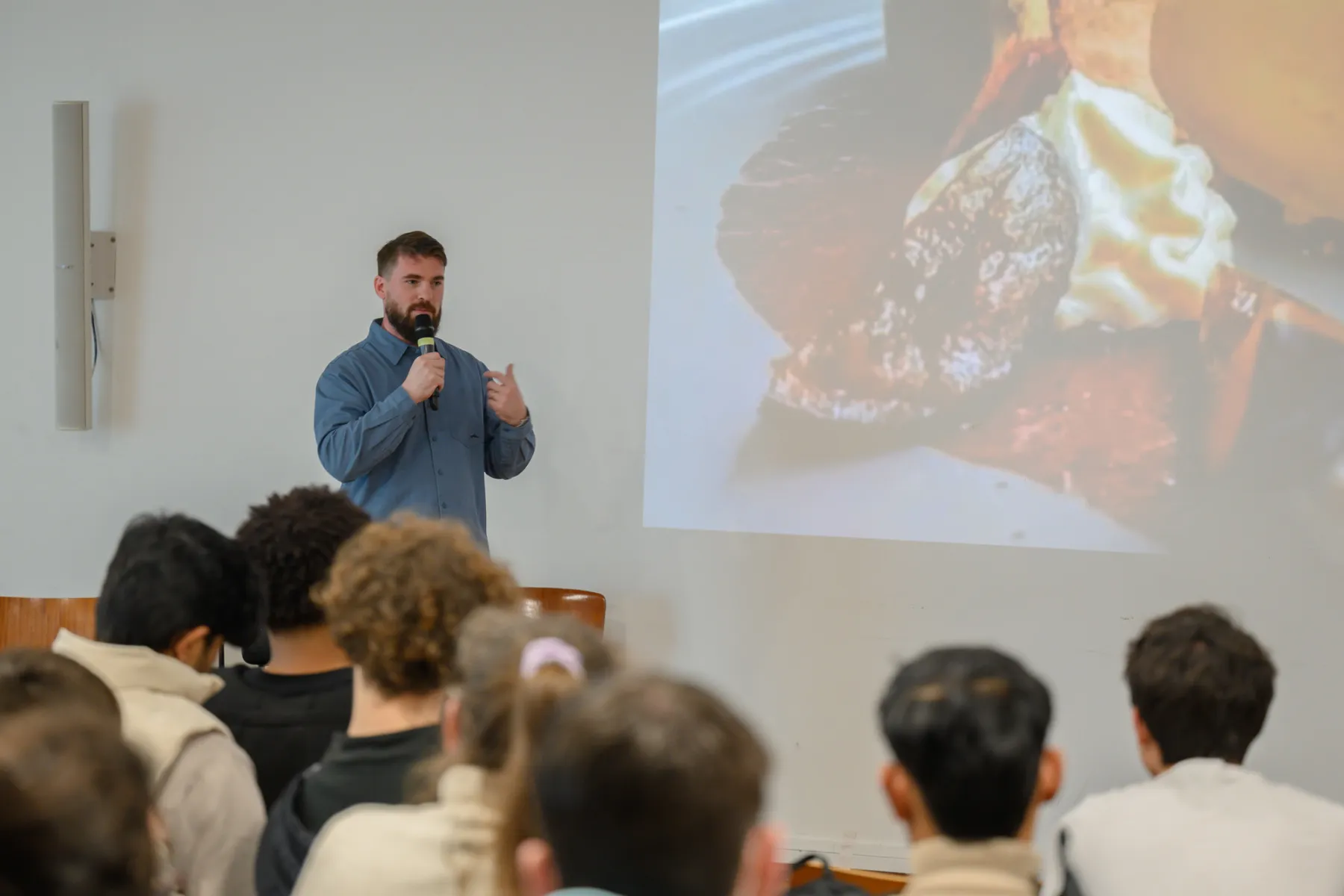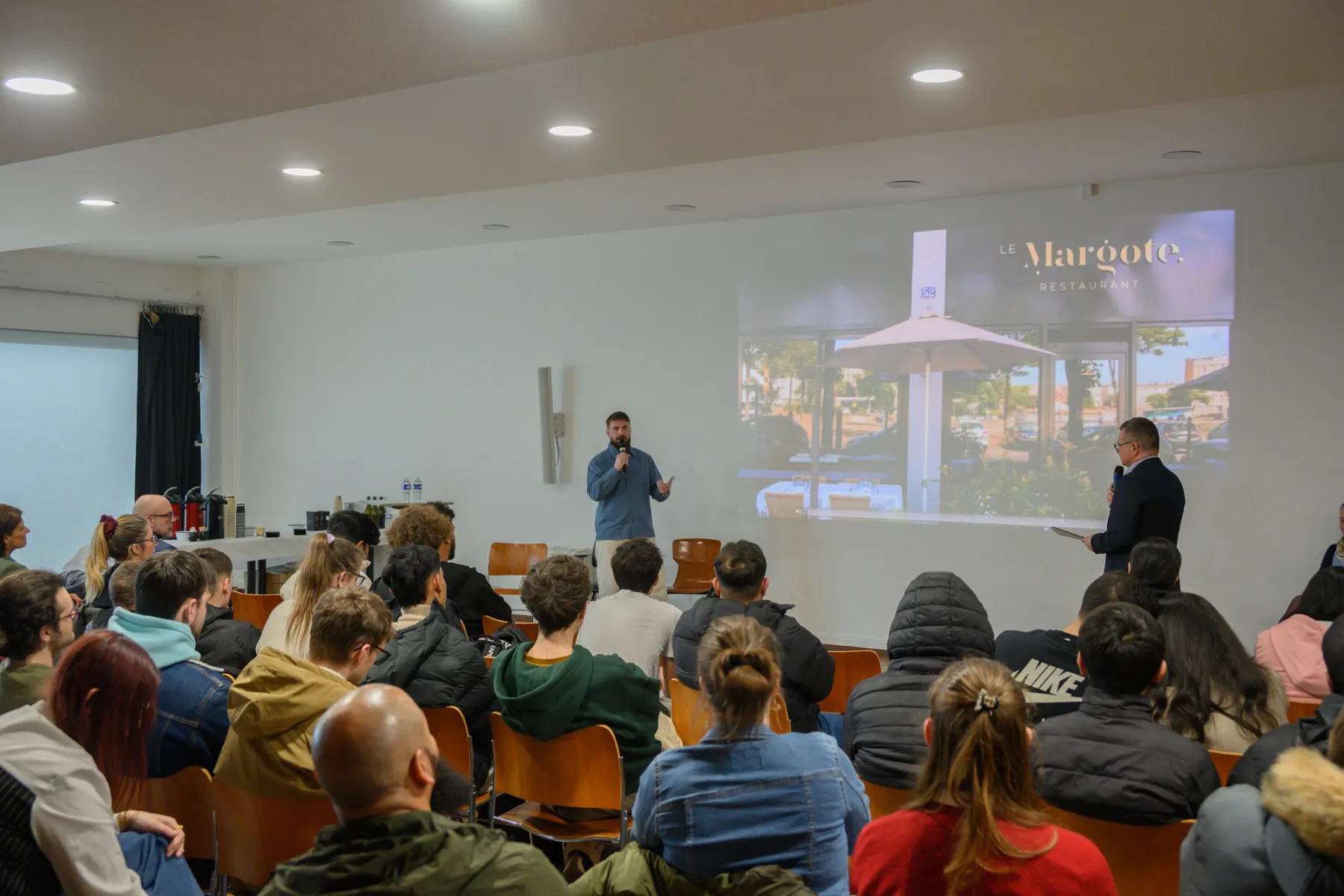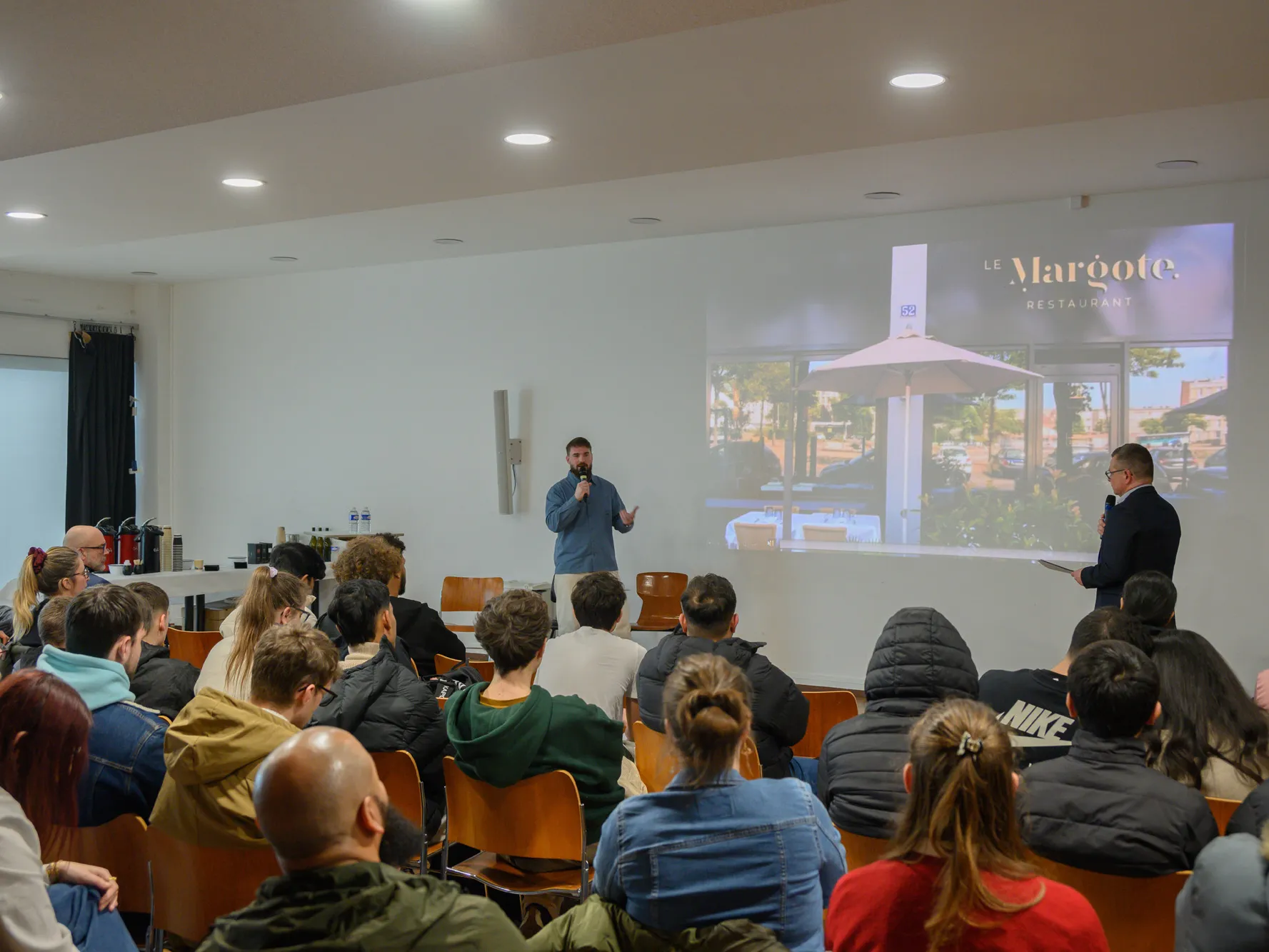 Ce jeudi 5 février, ce sont ainsi plus de 65 personnes qui se sont réunies au Musée d'art moderne André Malraux (MuMa) autour de Gauthier Teissère, chef cuisinier et co-gérant du restaurant gastronomique Le Margote, parmi lesquelles de nombreux collégiens et lycéens, mais aussi des personnes en recherche d'emploi, des personnes en situation de handicap ou encore des adultes curieux. Entouré de professeurs et de responsables pédagogiques du lycée Jules Le Cesne et du GRETA Côtes Normandes, le chef cuisinier a présenté son parcours professionnel et les qualités nécessaires pour s'engager dans la voie de la restauration, sous la forme d'une interview menée par un animateur.