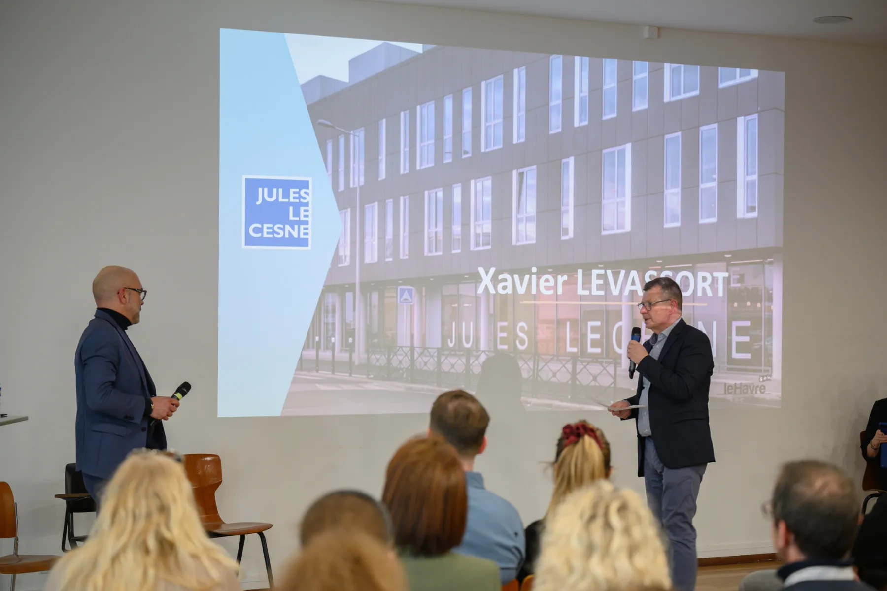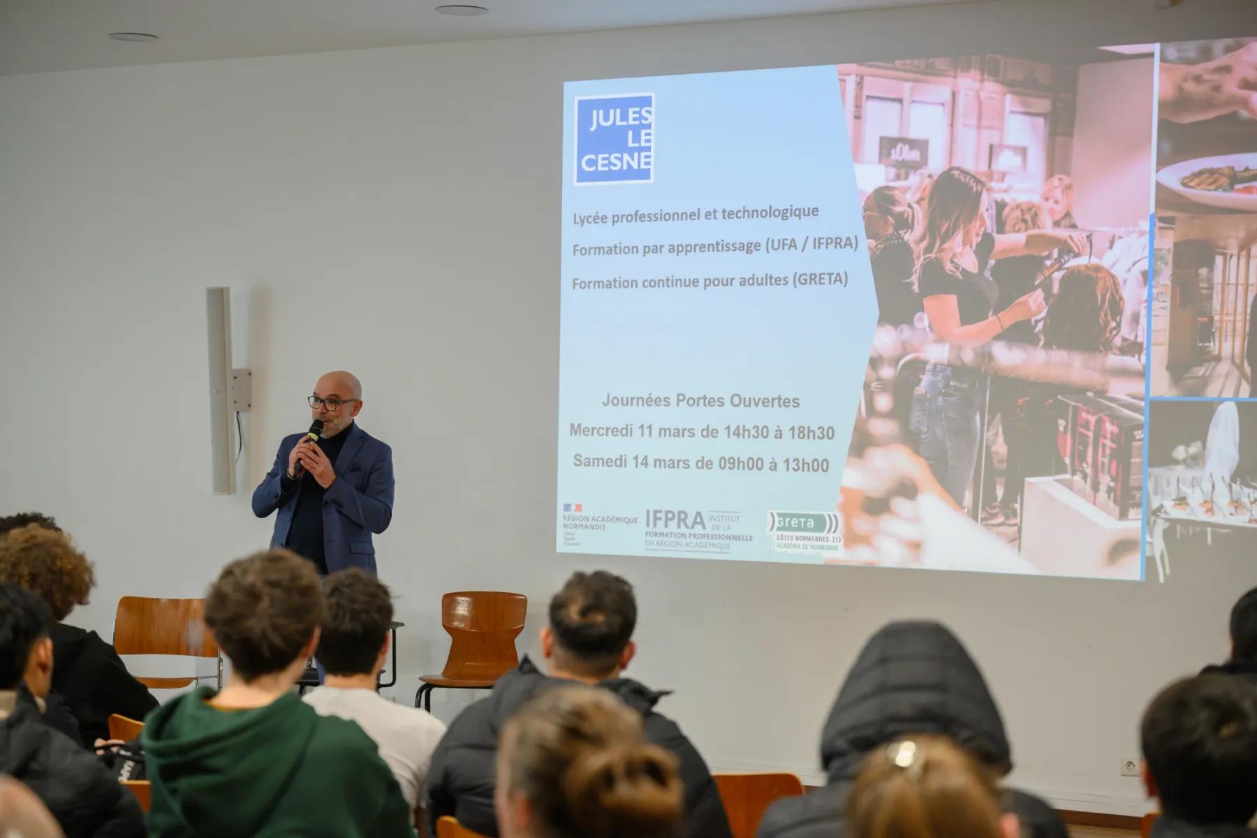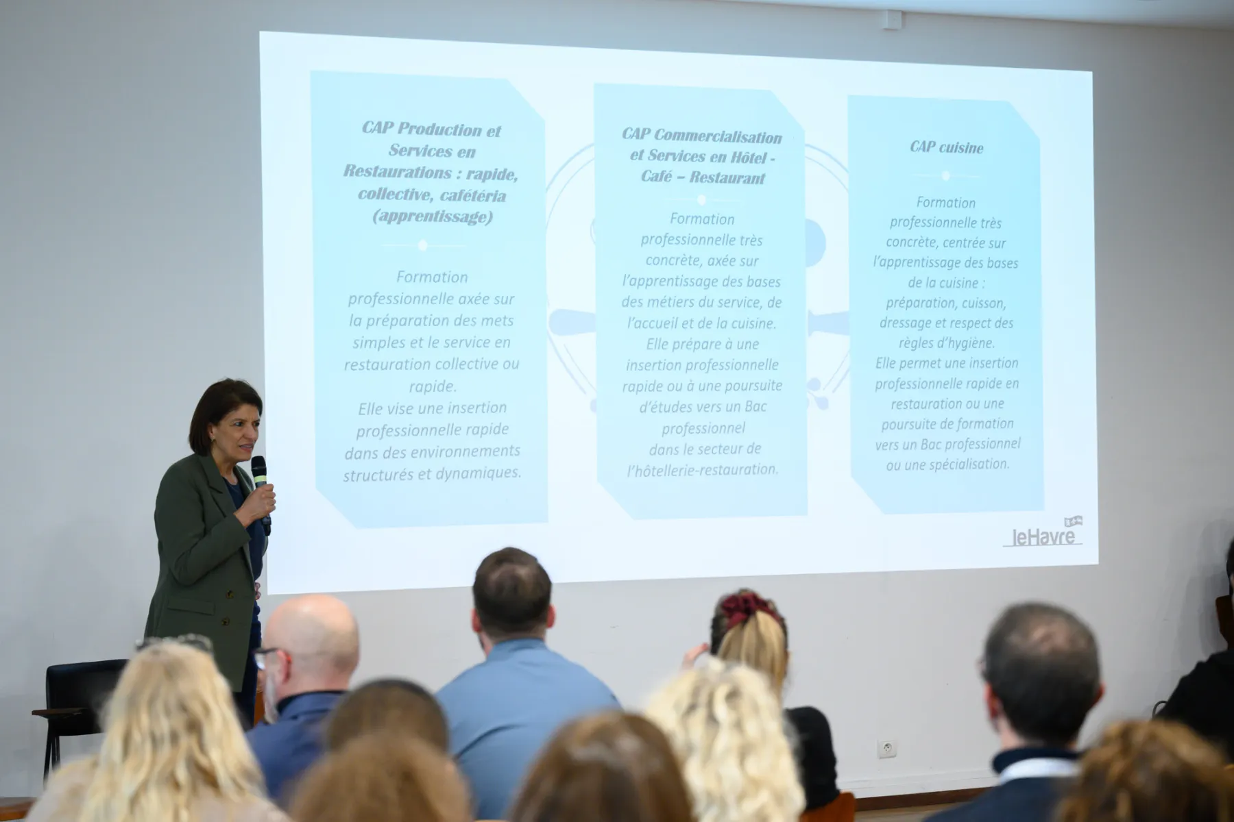 Ce jeudi 5 février, ce sont ainsi plus de 65 personnes qui se sont réunies au Musée d'art moderne André Malraux (MuMa) autour de Gauthier Teissère, chef cuisinier et co-gérant du restaurant gastronomique Le Margote, parmi lesquelles de nombreux collégiens et lycéens, mais aussi des personnes en recherche d'emploi, des personnes en situation de handicap ou encore des adultes curieux. Entouré de professeurs et de responsables pédagogiques du lycée Jules Le Cesne et du GRETA Côtes Normandes, le chef cuisinier a présenté son parcours professionnel et les qualités nécessaires pour s'engager dans la voie de la restauration, sous la forme d'une interview menée par un animateur.