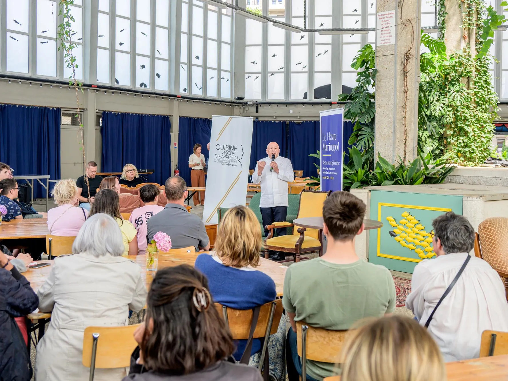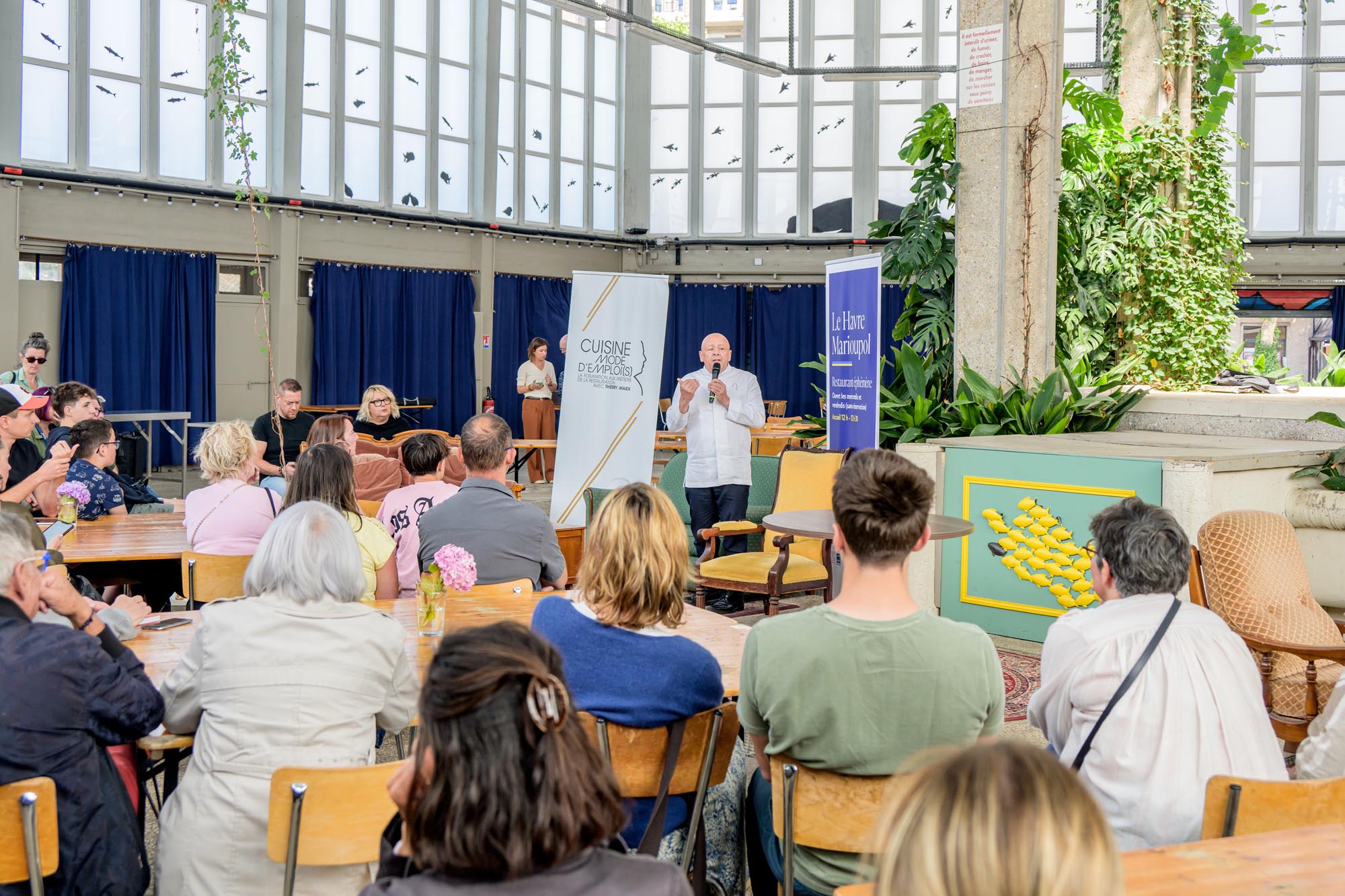 La Halle aux Poissons a accueilli, le 8 juillet, un hôte de prestige : Thierry Marx, chef doublement étoilé et fondateur du réseau d’écoles Cuisine Mode d’Emploi(s). Dans une atmosphère à la fois conviviale et attentive, il a échangé avec le public havrais, les partenaires du projet, ainsi qu’avec les stagiaires de la formation actuellement en cours au Havre.