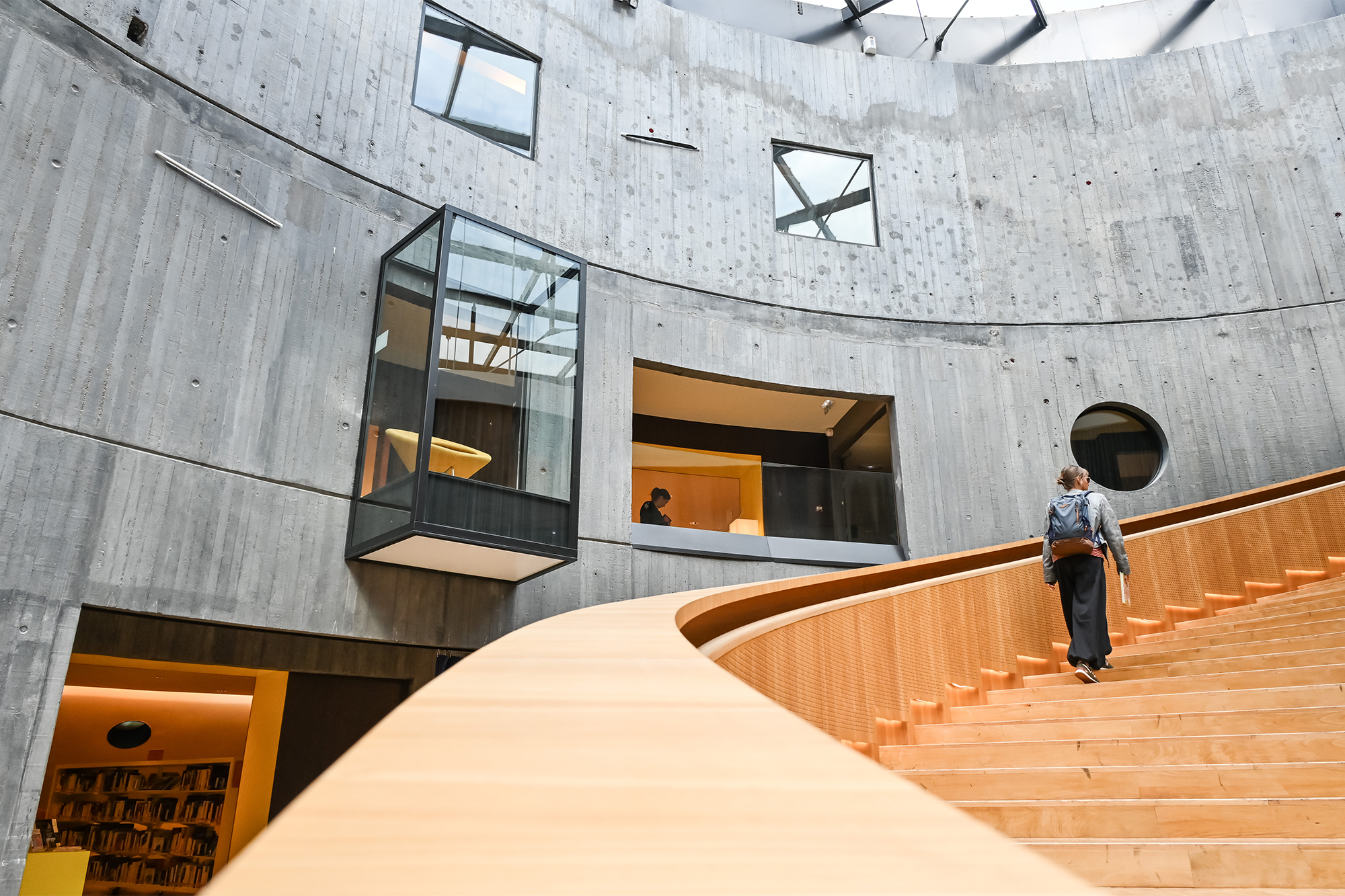 Tant par son extérieur, dont les courbes blanches dessinées par Niemeyer viennent contraster les structures rectilignes de l'architecture Perret, qu'à travers son intérieur, où le béton brut dialogue avec le bois de châtaigner aux notes chaleureuses, la bibliothèque se veut un lieu unique qui dénote pour mieux s'intégrer.