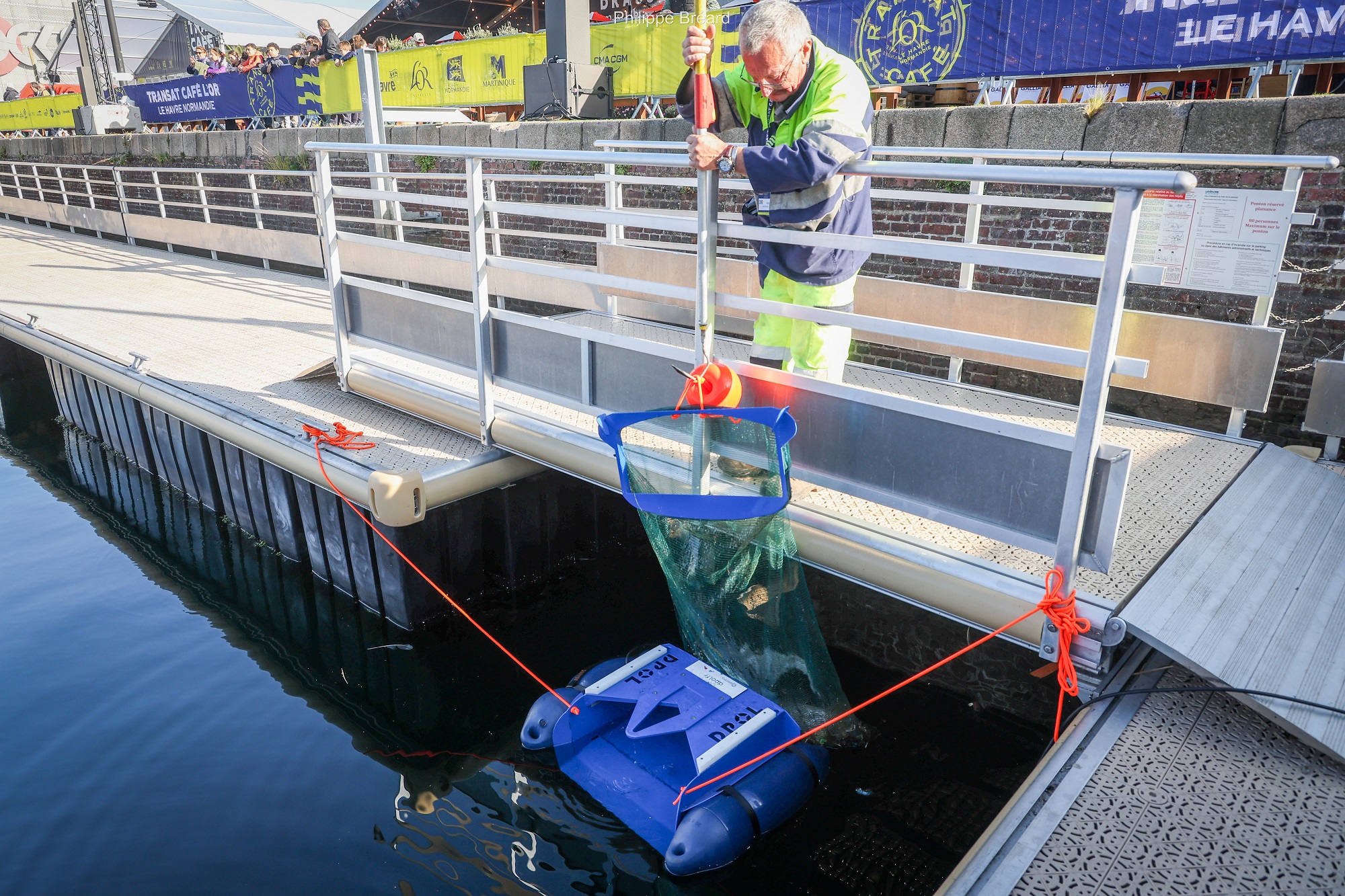 À l'occasion de la TRANSAT CAFÉ L'OR Le Havre Normandie, la Ville du Havre profite des festivités pour tester un système innovant de récupération des déchets dans le bassin Paul Vatine, actuellement occupé par les bateaux des skippers en lice pour la course.