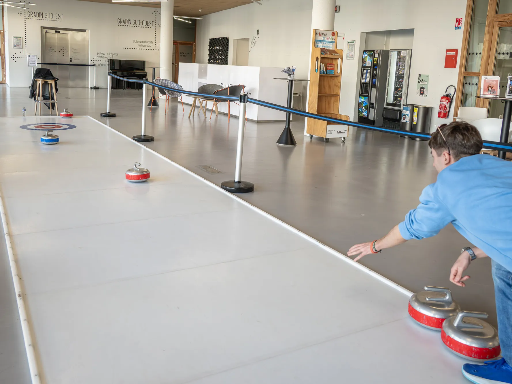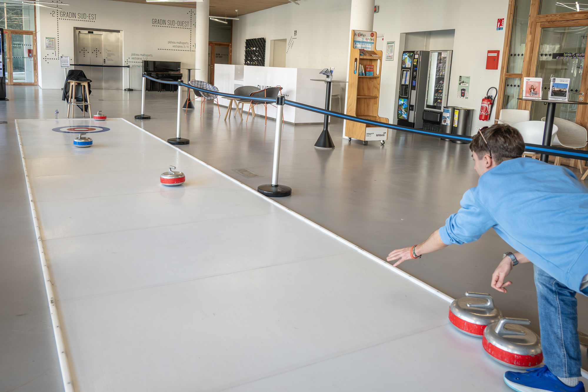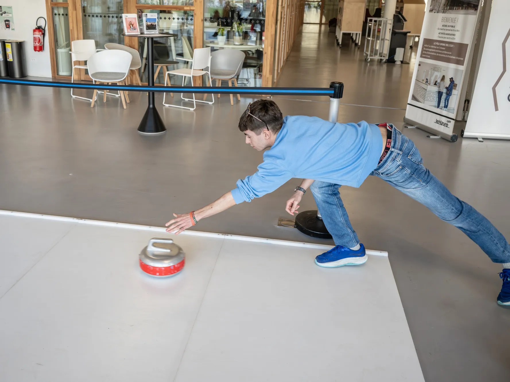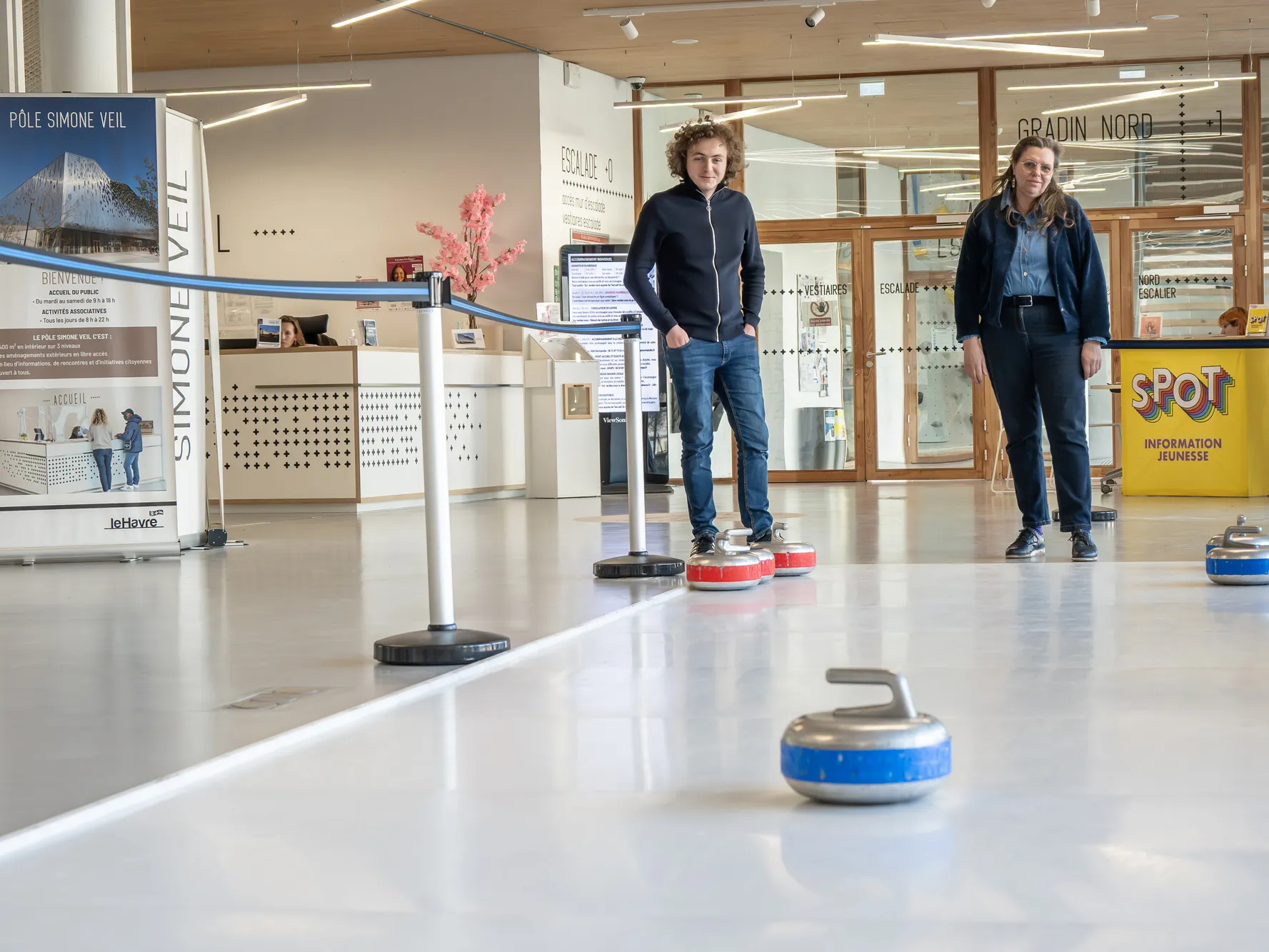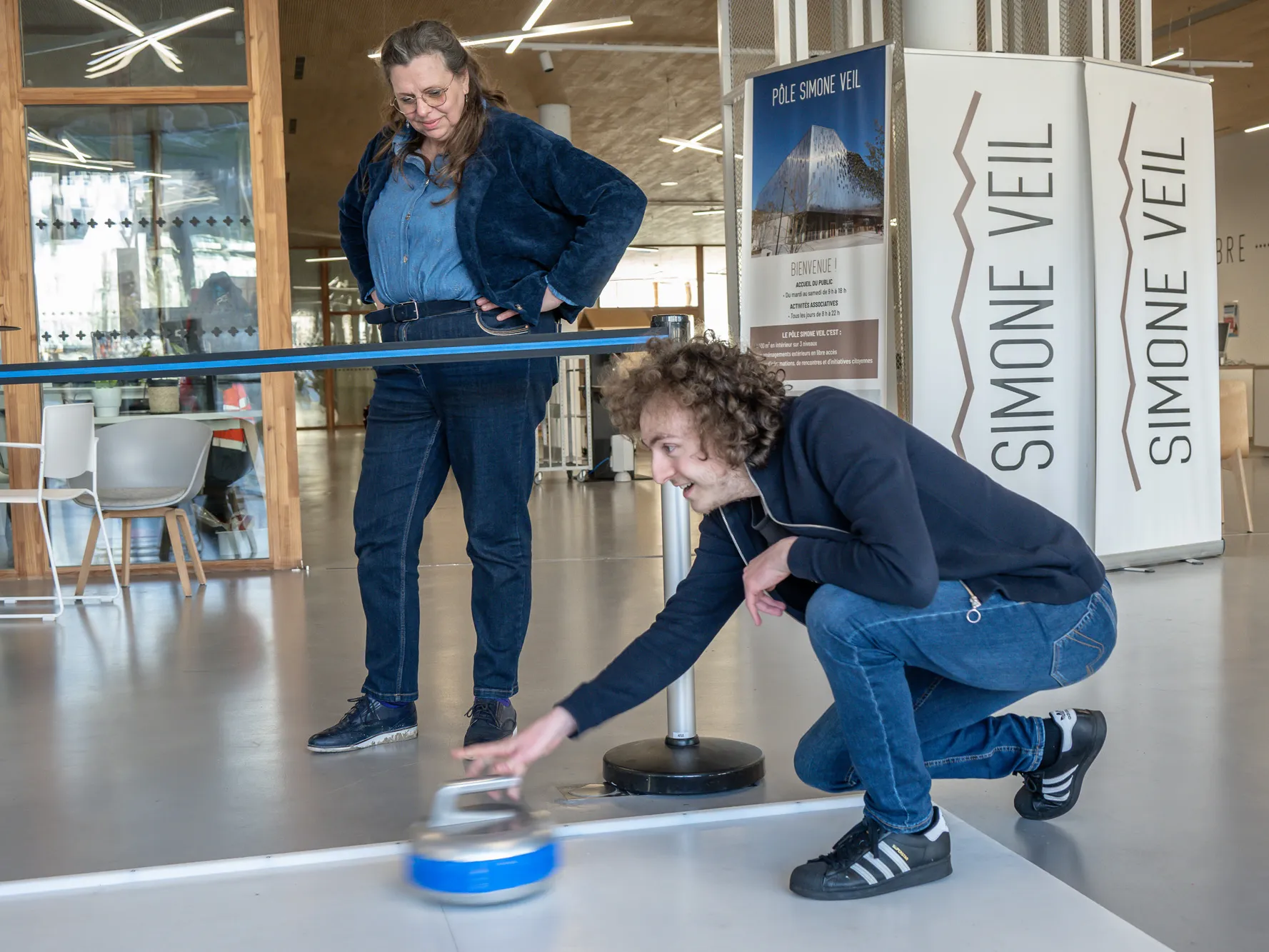 Pas de glace au Pôle Simone Veil mais une piste en plexiglass de 10 mètres par 2, et des pierres lestées et sur roulettes imitant le comportement des véritables pierres de curling. L'occasion pour les curieux de découvrir cette discipline encore assez peu répandue en France, mais qui fait pourtant appel à de nombreuses compétences tant physiques qu'intellectuelles.