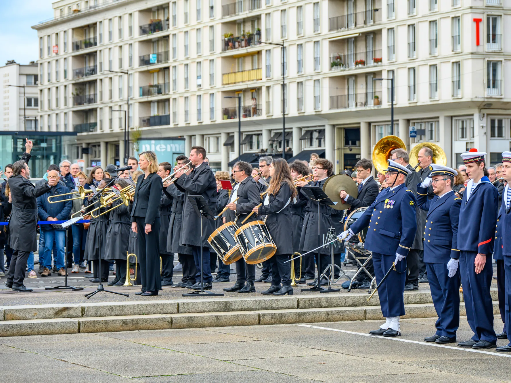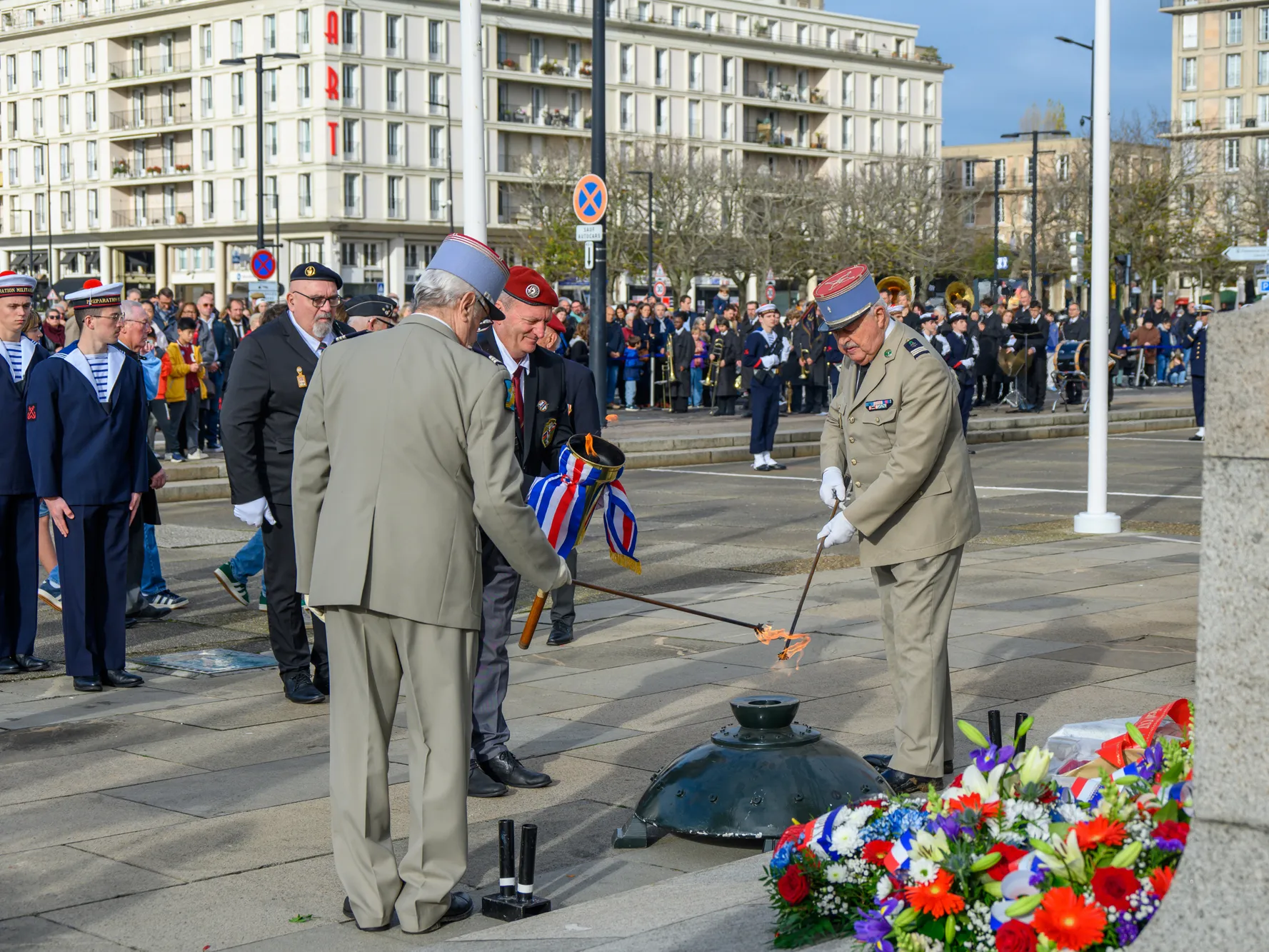 La commémoration s'est poursuivie devant le Monument aux Morts et de la Victoire, place du Général de Gaulle, où les autorités ont été accueillies par le Commandant d'Armes de la place du Havre, Fabrice COHELEACH. L'Orchestre d'Harmonie a ensuite interprété le refrain de La Marseillaise ainsi que la Marche des soldats de Robert Bruce, avant une lecture du message de Catherine VAUTRIN, ministre des Armées et des Anciens combattants, par Elsa PEPIN, sous-préfète du Havre. Après le dépôt de gerbes de fleurs, la Flamme sacrée, recueillie le lundi 10 novembre sur la tombe du Soldat Inconnu par les anciens combattants et victimes de guerre du Havre, a été ranimée par Louis VALLERY, président de l’AMAC et Claude LOGEZ, président de la FAMMA.