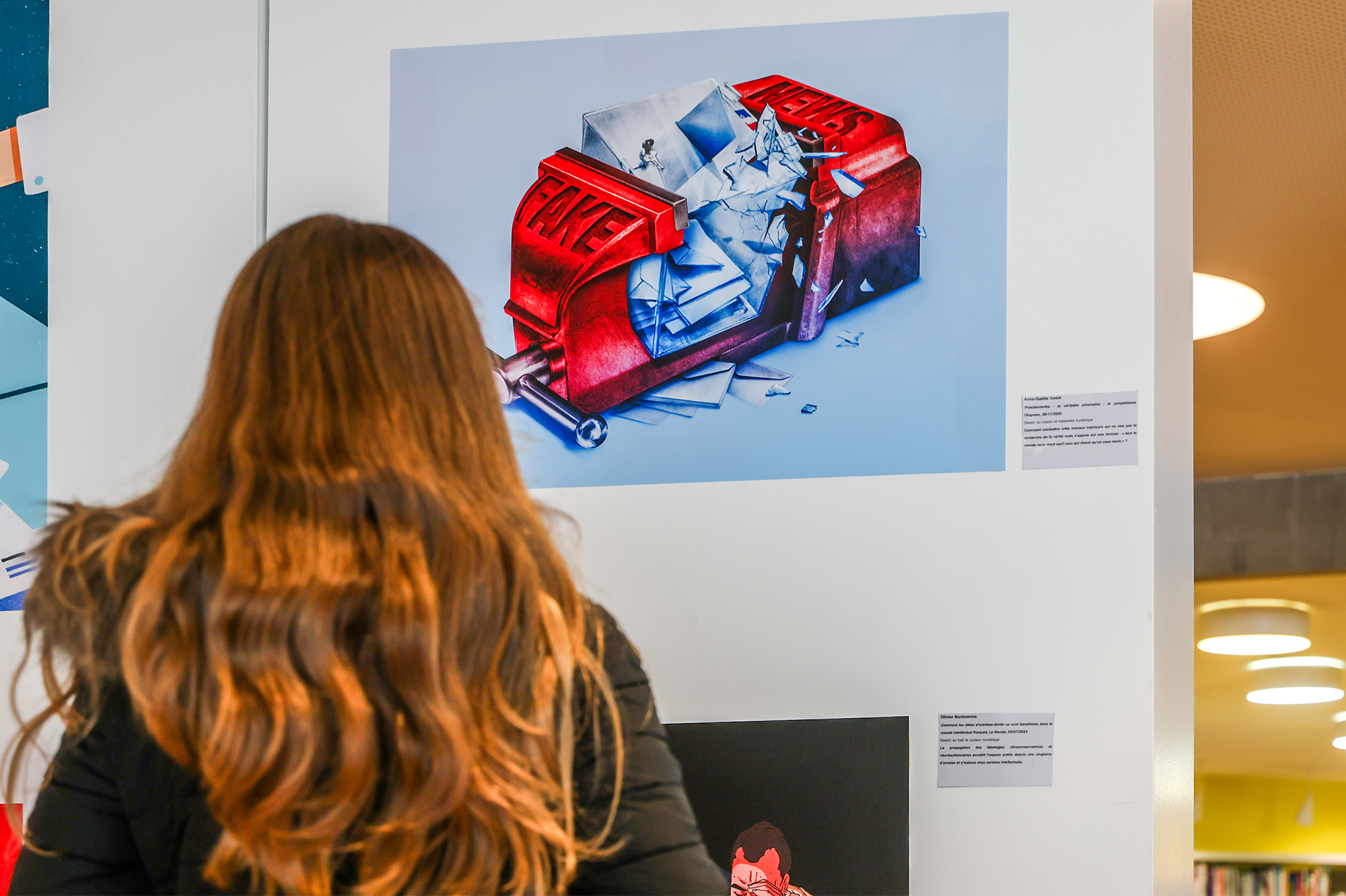 À l'instar de l'affiche de l'évènement, réalisée par Fanny Michaëlis, où une femme à bord d'une embarcation semble naviguer avec pour rame un crayon, l'exposition met aussi l'accent sur l'avènement des "fakes news" (ou "infox"), et leurs répercussions sur la société et la perception de l'information par le grand public. On retiendra en particulier cette illustration d'une urne électorale, broyée par un étau représentant les fausses informations, dont la circulation est de plus en plus facilitée par les réseaux sociaux et les nouvelles technologies comme l'intelligence artificielle.