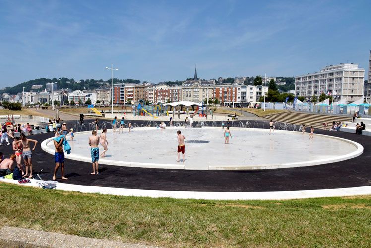 Ce projet minimaliste et respectueux de l'esprit original du front de mer du Havre visait à préserver l’esthétique voulue par les architectes. Pour réduire l'impact environnemental, les installations techniques ont été complètement refondues : un système de jets programmés et une réserve tampon permettent désormais le recyclage de l’eau en circuit fermé.