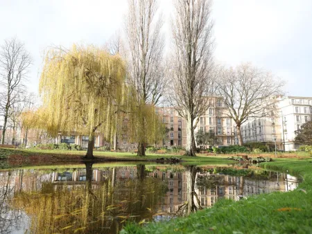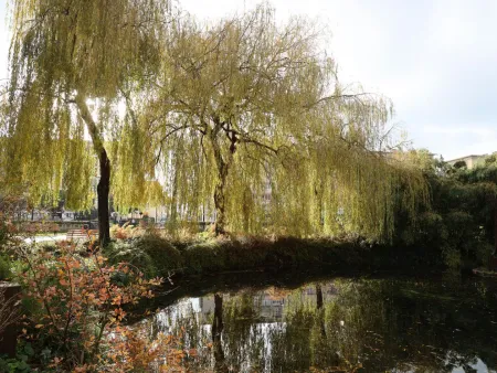 Si vous débutez votre promenade par l’entrée principale avenue Foch, vous découvrirez une partie de la roseraie qui s’étend un peu plus loin sur la gauche, côté rue Othon Friesz. Au bord du plan d’eau, les branches des grands saules pleureurs, frôlent la surface de l’eau. Légèrement en recul, le surprenant cyprès chauve s’élève en pyramide vers le ciel.