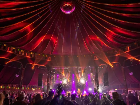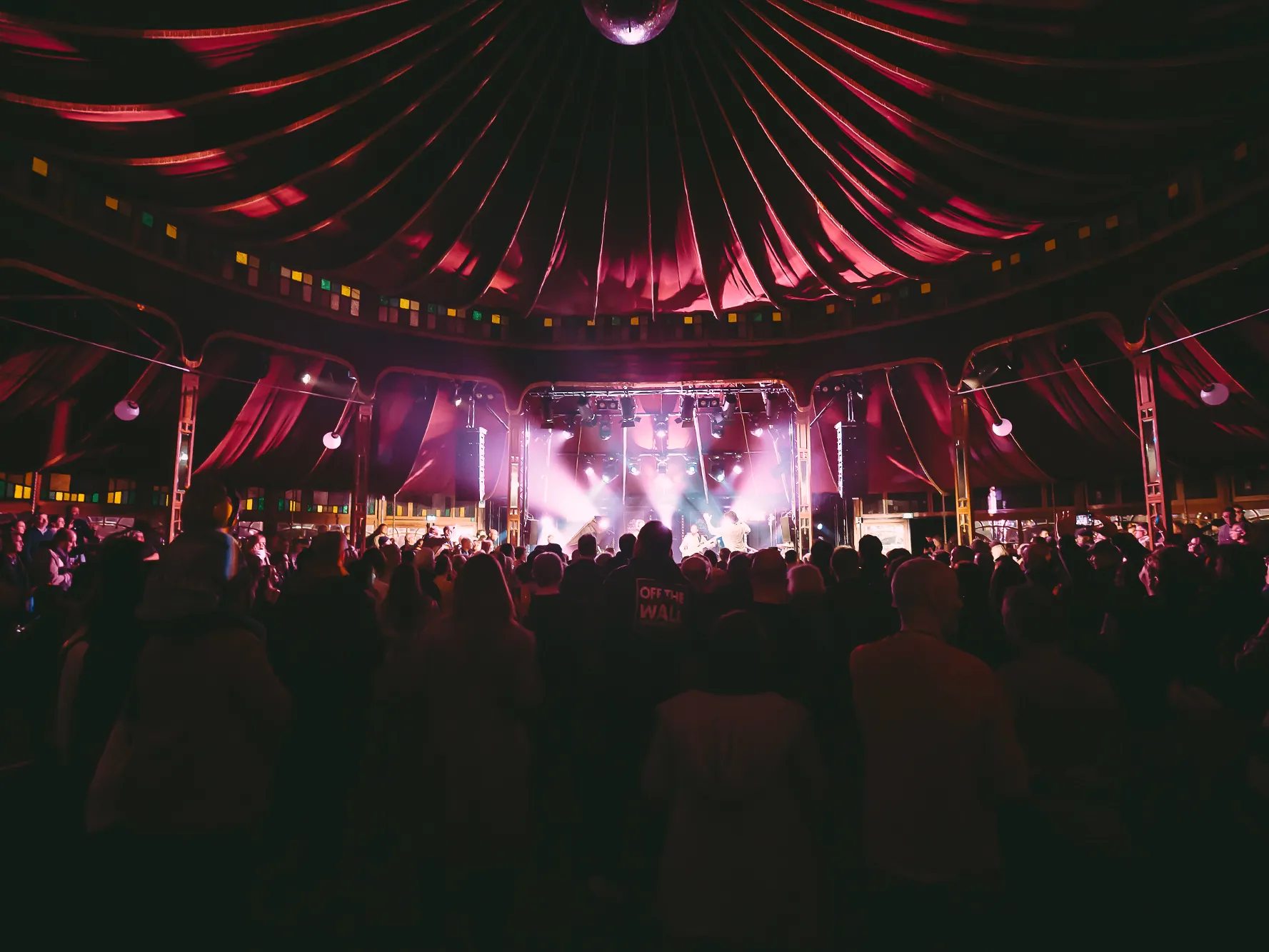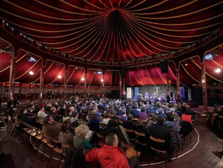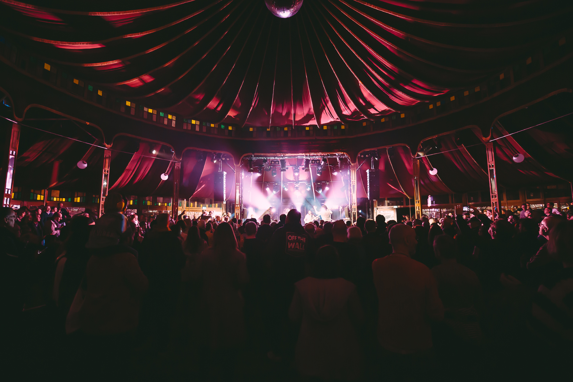 Conçu à la manière des salles de bal des années folles, ce chapiteau de bois révèle tout son charme à peine les portes franchies. On y découvre un abri chaleureux, un univers feutré, ambiance art nouveau. Dès son arrivée, le spectateur est enveloppé dans l’atmosphère chaude des velours carmins, des boiseries, vitraux et miroirs.