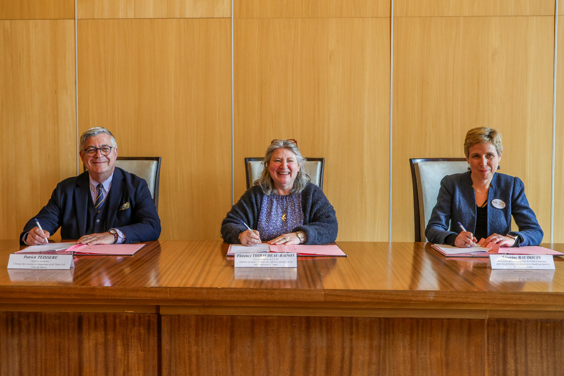 Séverine Baudoin, directrice adjointe du FIPHFP, Patrick TEISSERE, adjoint au maire chargé des ressources humaines, Florence THIBAUDEAU-RAINOT, adjointe au maire chargée des affaires sociales, des solidarités et de la santé, ont signé, en présence de Carène Guillemet, directrice territoriale handicap du FIPHFP, une nouvelle convention de 3 ans. Cette signature avec le Fonds pour l’insertion des personnes handicapées dans la Fonction publique (FIPHFP) permet d’assurer la pérennisation des actions engagées depuis 14 ans par la Ville du Havre et le CCAS.