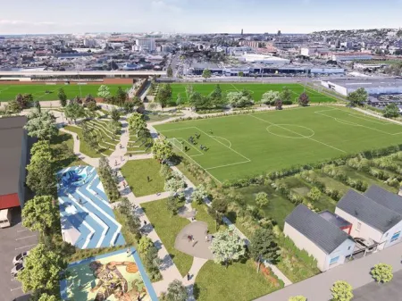 - un parc paysager de 12 000 m² environ, dédié aux pratiques sportives libres, intégrant du mobilier urbain et des aménagements paysagers.