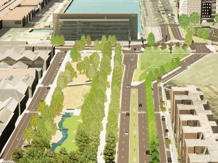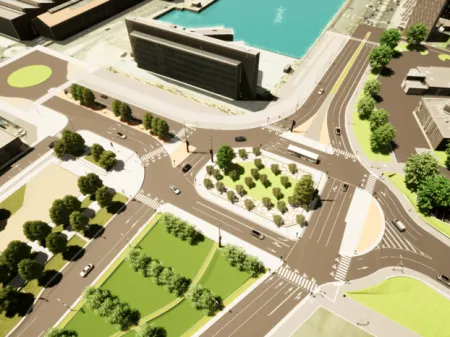 Le projet d'entrée de ville maintient et améliore la fonction d'entrée de ville tout en remédiant aux handicaps. L'aménagement d'un grand boulevard urbain apaise et fluidifie la circulation, limite les risques de bouchons même en heures de pointe, et rend accessibles les deux rives grâce à la création de carrefours.