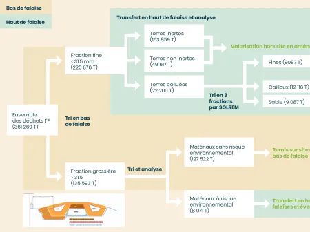 Les matériaux fins, ainsi que les matériaux grossiers présentant un risque environnemental, seront de nouveau triés sur une autre plateforme en haut de falaise à une granulométrie plus fine, garantissant ainsi une optimisation de la valorisation des matériaux.