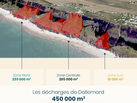 Situées en contrebas des falaises du plateau au Havre, les anciennes décharges de Dollemard ont été exploitées tout au long de la seconde moitié du XXe siècle par des sociétés privées principalement pour l’élimination de déchets issus de la filière du bâtiment. Fermées définitivement au début des années 2000, ces décharges sont exposées, pour parties, aux risques de submersion marine et d’érosion qui provoquent une pollution du milieu marin en relâchant des déchets à la mer. Le site classé Natura 2000 (habitat naturel exceptionnel) présente des habitats d’espèces protégées mais aussi des plantes exotiques invasives à maîtriser.