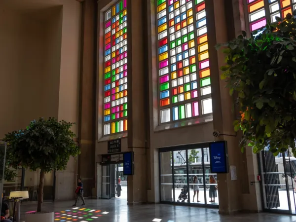 Pour Un Été Au Havre, Isabelle Cornaro poursuit ses réflexions sur les objets et leur image, sur la notion d'original et de copie. Invitée à intervenir sur la gare du Havre, l’artiste s’est inspirée de l’emblématique église Saint-Joseph, qui l’a beaucoup marquée lors de ses séjours. Elle en a imaginé une double relecture, un hommage dédoublé au talent d’Auguste Perret. En ouverture de la saison, elle métamorphose les grandes baies vitrées de la gare du Havre en s’inspirant du nuancier de couleurs des vitraux de l’église, dessinés par Marguerite Huré. Comme si les mille facettes colorées du monument venaient épouser le bâtiment de la SNCF, une multitude de teintes savamment agencées jouent avec les mouvements du soleil et des nuages pour faire vibrer le parvis extérieur et le hall intérieur de la gare. Ainsi transformée, la gare devient un écho, une résonance aux incessantes variations chromatiques du célèbre édifice Havrais.