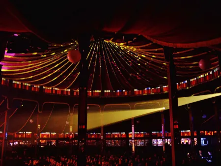 Au centre de cet espace circulaire, une piste de danse en parquet de bois s’offre au public et conforte le sentiment de convivialité propre à cette salle.