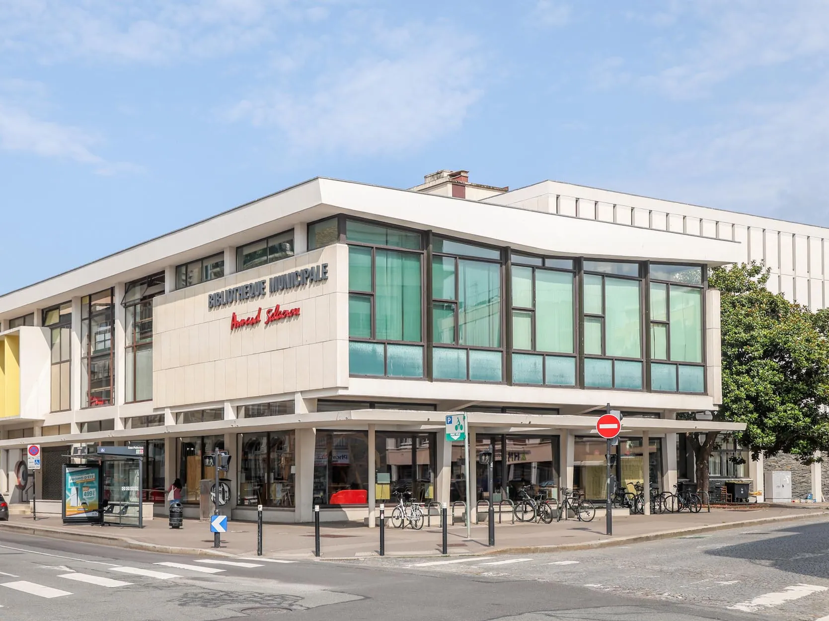 Conçu par les architectes Jacques Lamy et Jacques Tournant, cet édifice pionnier de la Reconstruction, anticipe l’essor des bibliothèques municipales modernes : les espaces publics sont exposés à la lumière naturelle, tandis que les bureaux sont situés à l’arrière. Les « magasins », locaux destinés au stockage des documents, sont répartis sur 4 étages, desservis pas un escalier hélicoïdal. Son toit évoque un livre ouvert.