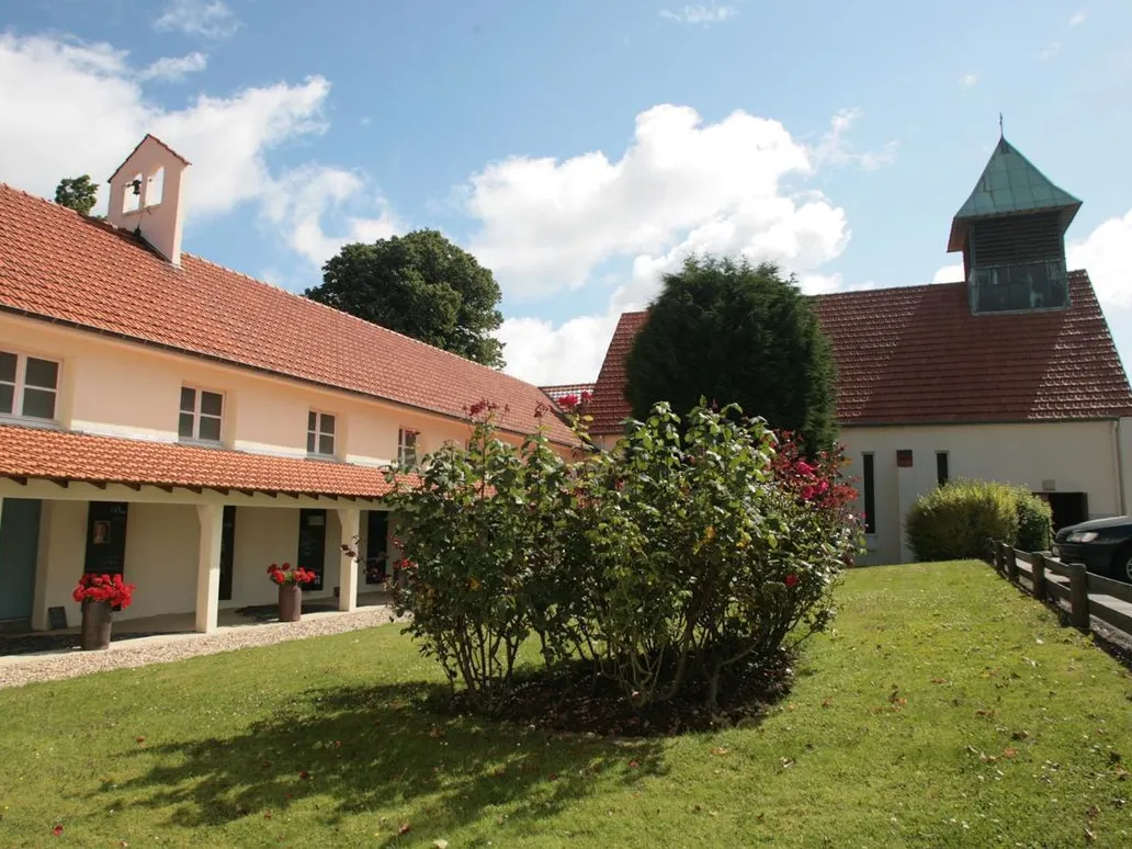 L’architecte Leroy conçoit des bâtiments très simples couverts de tuiles rouges : à droite la chapelle, au centre le mur sud du cloître, à gauche l’hôtellerie. Prient et travaillent dans ce monastère de la Transfiguration une vingtaine de Carmélites (religieuses catholiques).