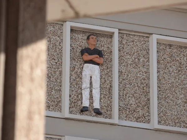 Des sections de façades préfabriquées prévoient à intervalles réguliers des cadres de baies où peuvent être réalisées des fenêtres. En fonction de la distribution intérieure des espaces, certains de ces cadres ne sont pas ouverts. Ces places vacantes ont amené Stephan Balkenhol à imaginer des personnages qui pourraient se mêler à ceux, bien réels, des habitations, qui apparaissent derrière leurs vitres.