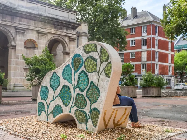 Ces trois bancs sont réalisés en béton pré-fabriqué, évoquant la matière même du centre-ville reconstruit par Auguste Perret après la guerre. Les dossiers des bancs sont recouverts de mosaïques disposées à la manière d’une “fragmentation structurée”.