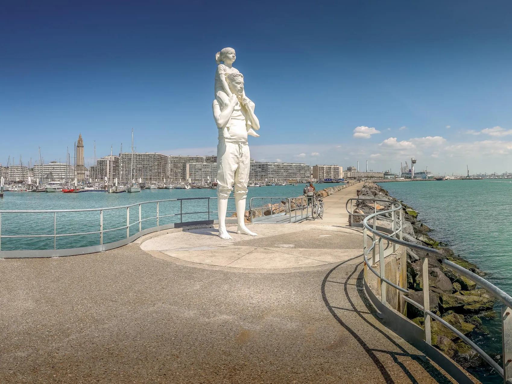 Les deux personnages observent, de leurs 6,24m de haut, l’horizon maritime et les navires qui le traversent. Par une ligne imaginaire, ils regardent aussi vers New York, autrefois reliée au Havre par la ligne Transatlantique. Un rappel du passé qui résonne particulièrement dans l’histoire familiale de l’artiste, et dans celles de tant d’autres Havrais et Havraises. Mais cette sculpture témoigne aussi de la filiation, de l’amour d’un père accompagnant sa fille jusqu’à ce qu’elle puisse suivre son propre chemin.
