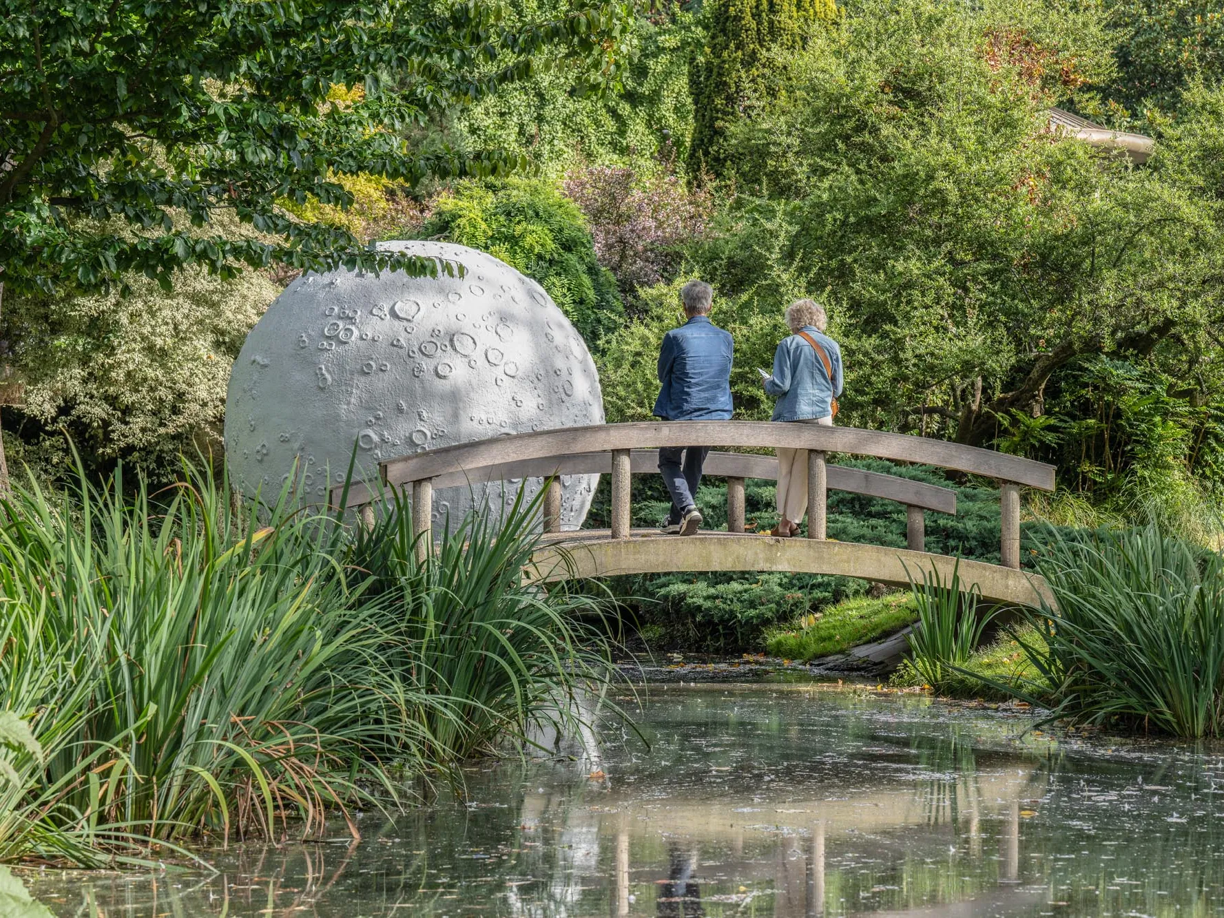 L’astre repose sans gravité, au cœur de la végétation ; une image surréaliste prend forme, pose les prémices d’une histoire fabuleuse. La Lune ne pouvait pas mieux tomber, dans cet écrin romantique et arboré. Habituellement insaisissable, elle prend ici de l’épaisseur et de la matière, et sa surface évoque d’ailleurs le béton granuleux des surfaces du centre-ville reconstruit. La comparaison entre cet objet et la ville portuaire ne s’arrête pas là : « Le Havre c’est comme la lune, c’est gris, c’est loin, personne n’y va et pourtant c’est un endroit fascinant.
