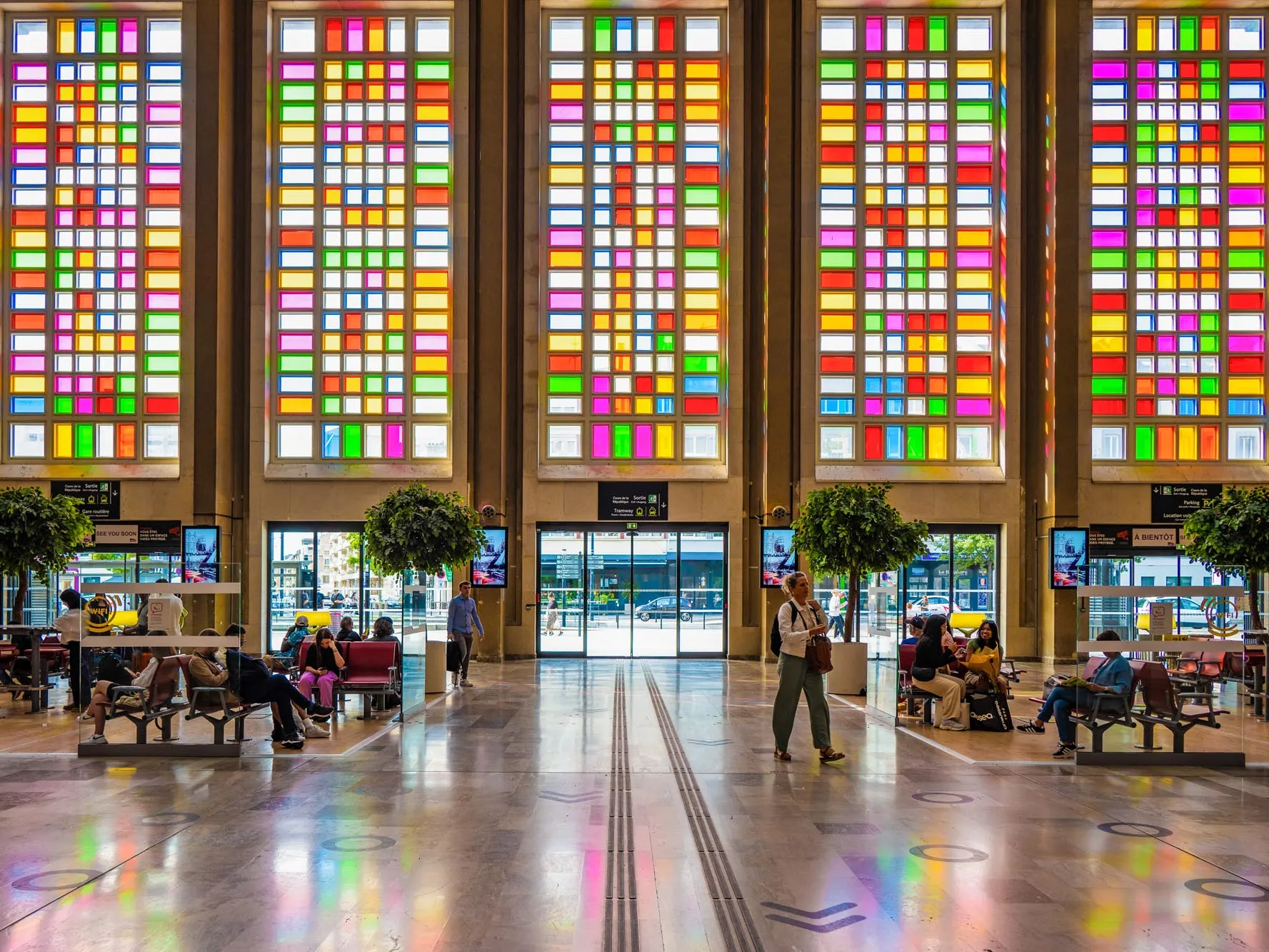 Pour Un Été Au Havre, Isabelle Cornaro poursuit ses réflexions sur les objets et leur image, sur la notion d'original et de copie. Invitée à intervenir sur la gare du Havre, l’artiste s’est inspirée de l’emblématique église Saint-Joseph, qui l’a beaucoup marquée lors de ses séjours. Elle en a imaginé une double relecture, un hommage dédoublé au talent d’Auguste Perret. En ouverture de la saison, elle métamorphose les grandes baies vitrées de la gare du Havre en s’inspirant du nuancier de couleurs des vitraux de l’église, dessinés par Marguerite Huré. Comme si les mille facettes colorées du monument venaient épouser le bâtiment de la SNCF, une multitude de teintes savamment agencées jouent avec les mouvements du soleil et des nuages pour faire vibrer le parvis extérieur et le hall intérieur de la gare. Ainsi transformée, la gare devient un écho, une résonance aux incessantes variations chromatiques du célèbre édifice Havrais.