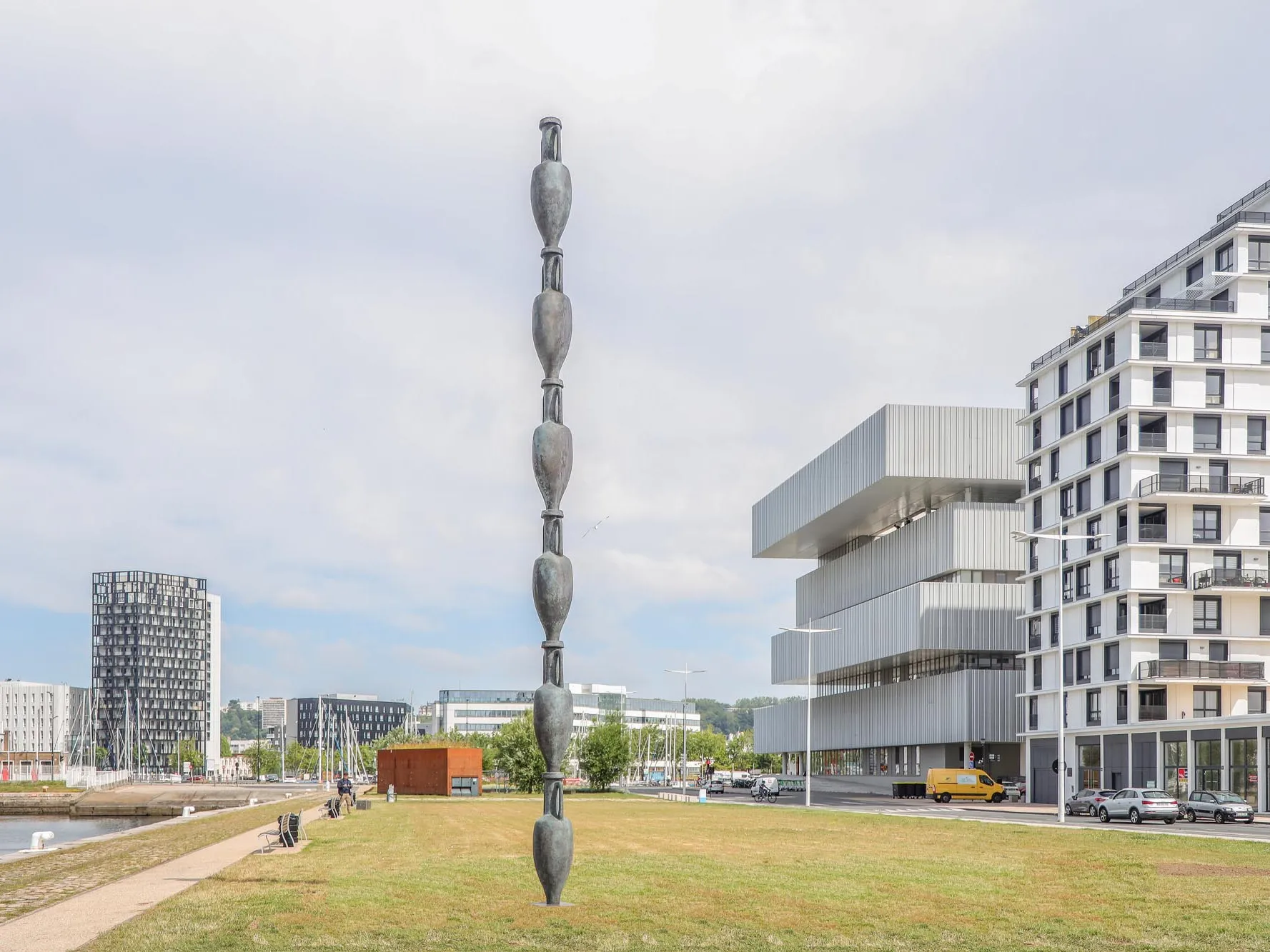 Pacifique est une sculpture en bronze patiné construite par la répétition d’une amphore qui s’empile six fois sur elle-même pour atteindre une hauteur de plus de 10 mètres. Dans l’antiquité, l’amphore était l’objet « standard » contenant de nombreuses marchandises dans les flux du commerce. Elles étaient chargées par centaines sur des navires parcourant le bassin méditerranéen, transportant vin, huile d’olive et autres produits de base : l’amphore était bel et bien le container antique... Edgar Sarin a souhaité imaginer au Havre une survivance de cette forme, un témoin érigé comme un repère dans l’espace et dans le temps. Ces amphores ainsi répétées les placent à l’échelle des containers contemporains que l’on aperçoit de l’autre côté du bassin. Elles s’inscrivent dans ce vocabulaire fait de mâts de bateaux, de grues ou de phares de signalisation, qui sont les lieux communs du port.