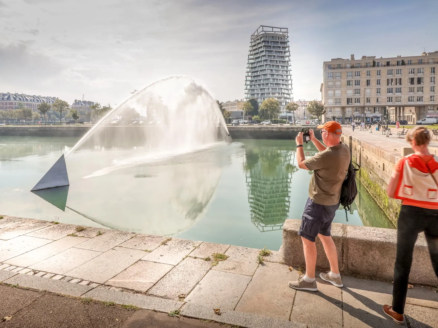 Dans le bassin du commerce, deux modules éloignés l’un de l’autre d’environ 60 mètres, projettent, par intermittence, des jets d’eau qui se rencontrent. Leur collision provoque l’apparition d’un spectre, d’une forme changeante et floue. Plus rarement, c’est un autre spectre qui devient visible à travers ses gouttes, celui du soleil, et l’arc se pare alors de teintes irisées. Dans tous les cas, il s’évapore après quelques minutes de contemplation et d’écoute, nous replaçant face à un bassin subitement regagné par le silence.