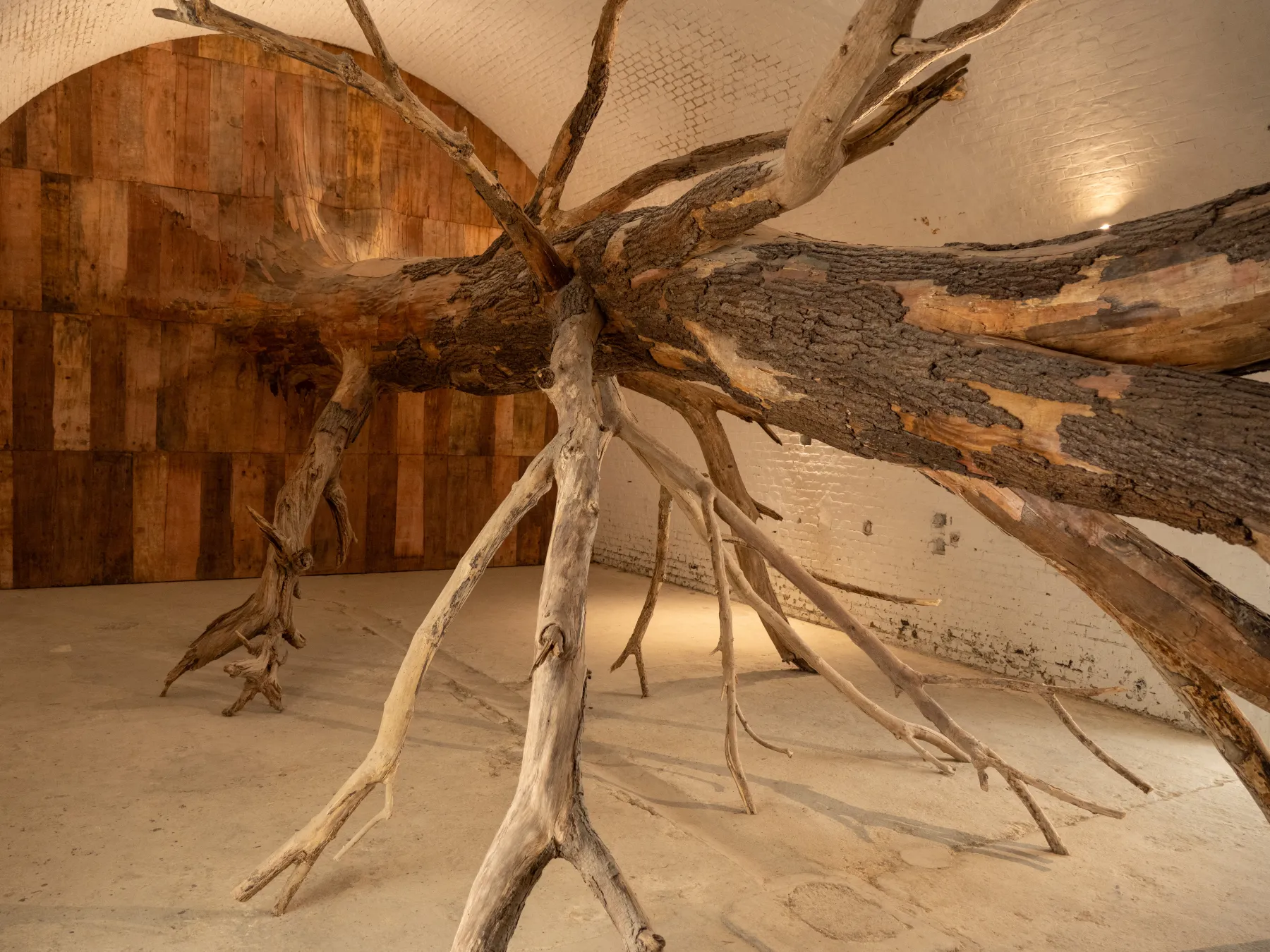 C’est dans cet ancien fort défensif isolé sur les hauteurs de la ville, dédié désormais à la préservation et la présentation des végétaux, que cette œuvre a naturellement trouvé sa place. Sisyphus Casemate se découvre en deux parties : d’abord une ouverture organique, mystérieuse sur un mur ; puis à l’intérieur, un arbre entier, une anomalie qui aurait poussé là à l’horizontal.