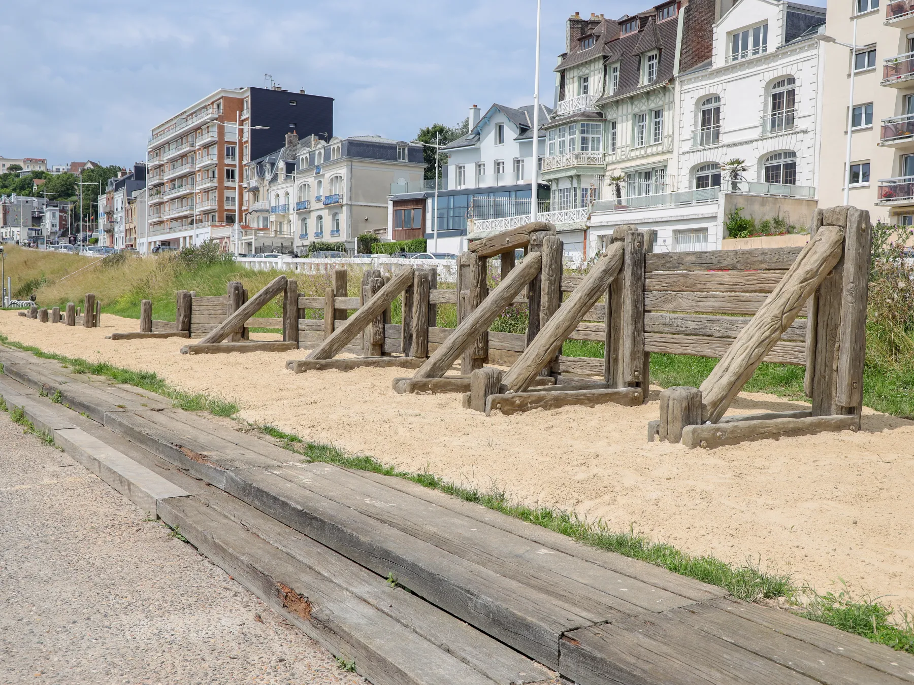 En février 2024, le dernier épi en bois de la plage du Havre a été démonté. En utilisant le rusticage (ou rocaillage), technique de modelage en ciment héritée des jardiniers du XIXème siècle pour imiter la nature, Stéphane Vigny reproduit l’épi dans son état d’usage, juste avant son enlèvement et à taille réelle (soit près de 30 mètres de long !) pour l’installer dans le prolongement de la promenade de la plage. L’épi de Stéphane Vigny fonctionne ainsi comme une sculpturetémoin, un objet à la fois décalé (l’original était à quelques dizaines de mètres…) et symbolique, puisque réalisé dans une technique qui est l’ancêtre du béton armé, si cher au Havre. Mais l’épi n’est cette fois plus soumis aux fracas incessants des galets qu’il est censé contenir : il trône désormais comme une relique de ce combat permanent que l’homme mène contre la nature pour maintenir le trait de côte. Sans ces ouvrages érigés depuis le Moyen-Âge - d’abord construits en bois puis en béton, tels qu’on les observe entre la plage et Sainte-Adresse - la mer, le vent et les galets auraient déjà largement creusé la falaise et la ville. L’épi de Stéphane Vigny est une version contemporaine du mythe de Sisyphe, condamné à se battre infiniment contre un rocher qui ne reste jamais immobile.